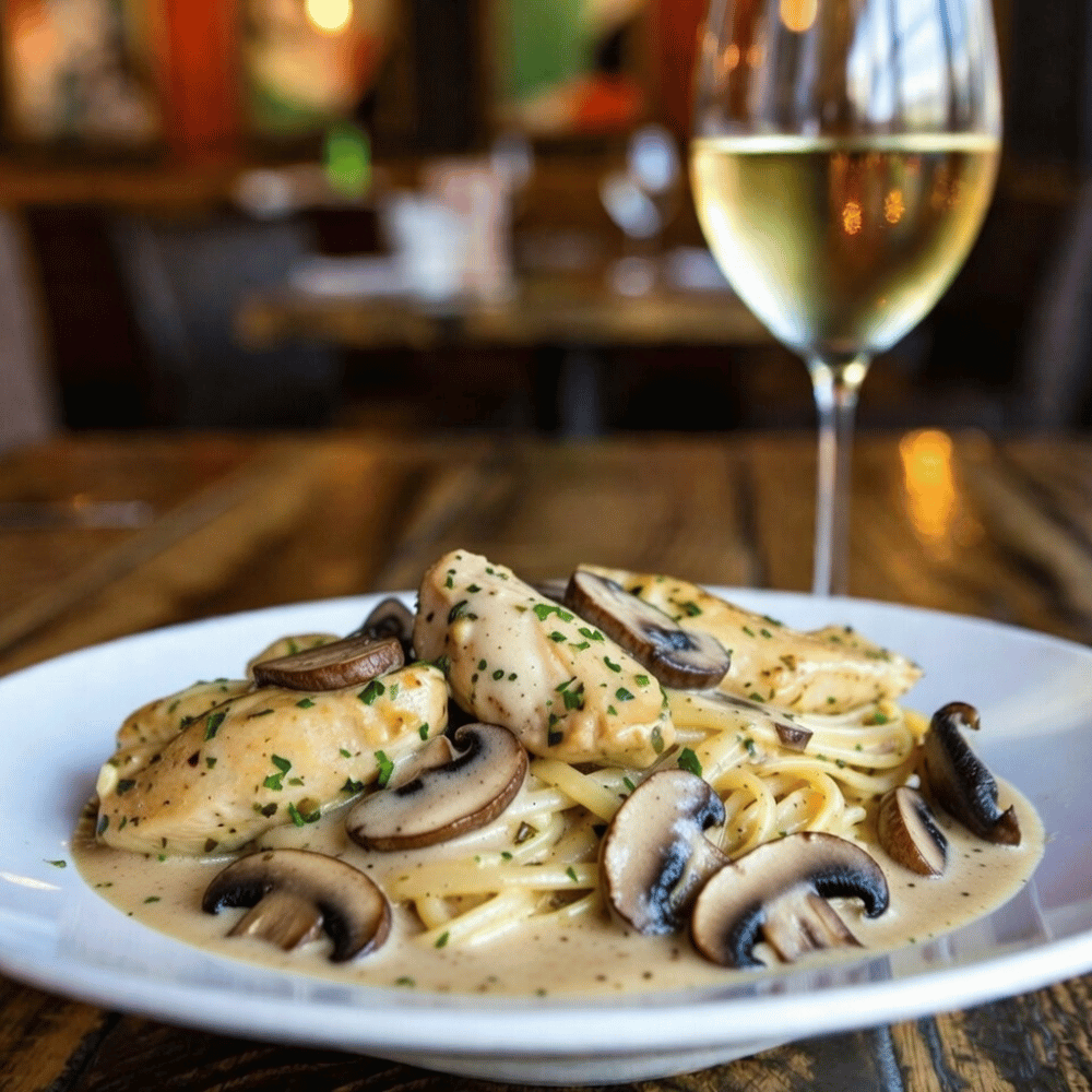 Chicken & Mushroom Alfredo with linguine in a garlic, parsley & cream sauce.